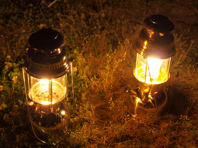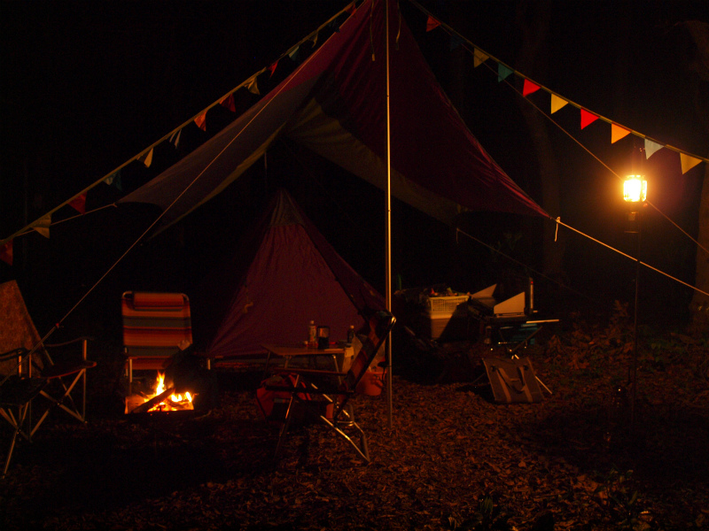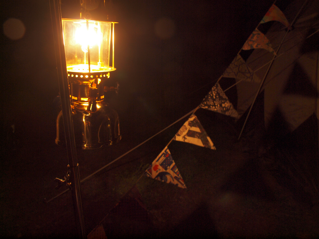 サイトはドッペルギャンガーのワンポールとアオゾラタープと設営が楽な組み合わせ、夜はランタンは2台のペトロマックスを同時に使う明るいサイト作りにしてみました。