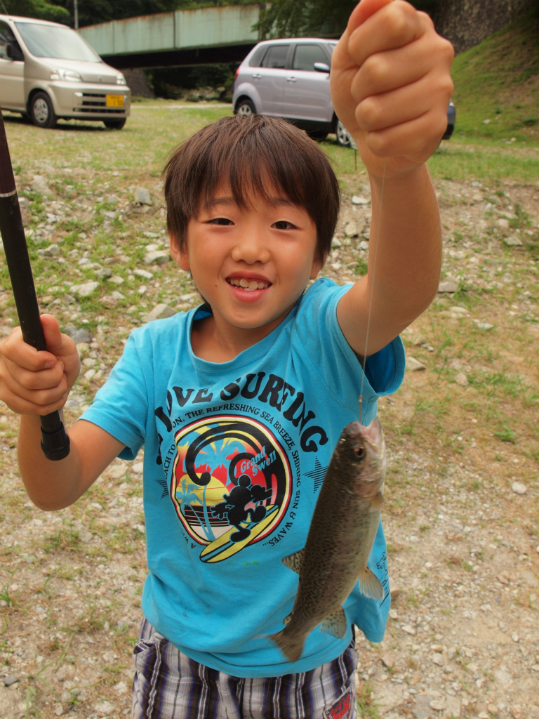 また釣堀で快獣クンはニジマスを釣り、大喜び。
