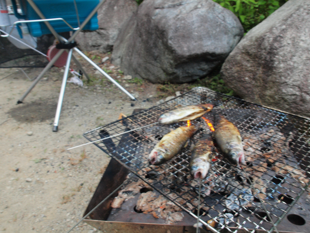 釣ったニジマスは焚き火で焼いて食べました。