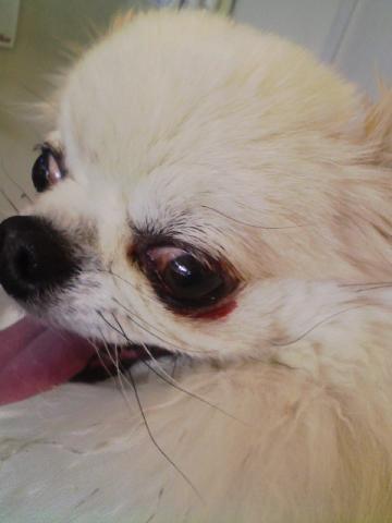 バトルのあとに珍獣ちゃんの左目が赤くなっていたので、よく見たら。。。流血。