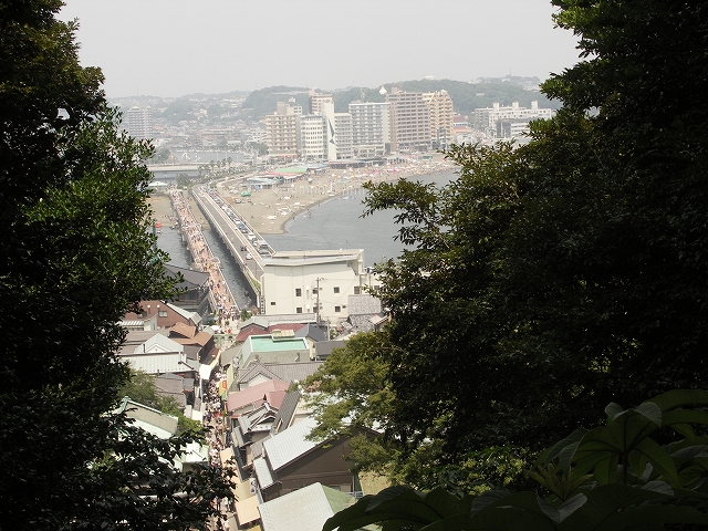 かなり登ってきたら眼下には江ノ島へ乗り入れようとしている車の列が。