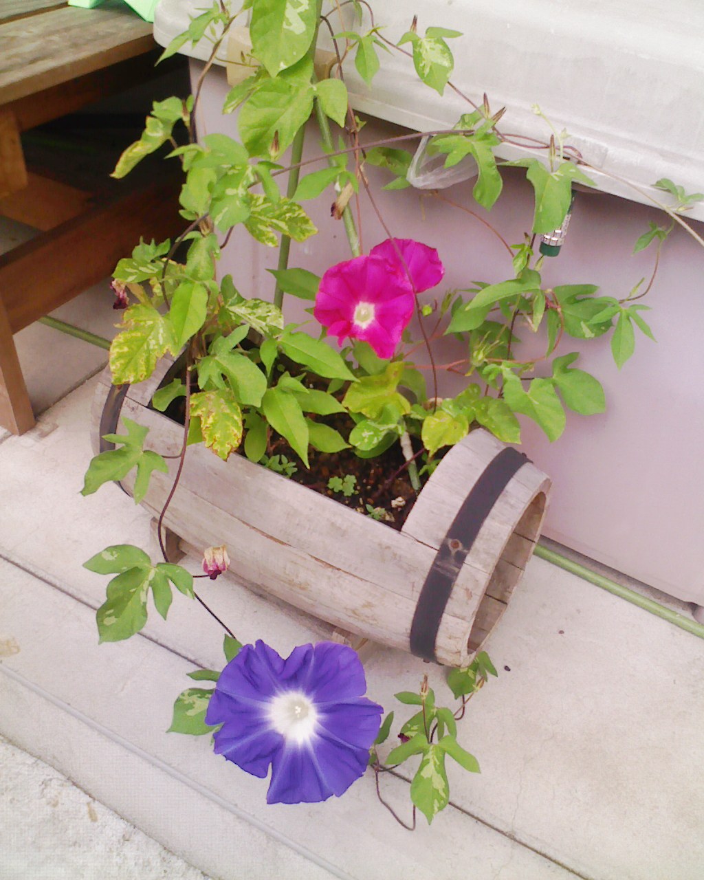 今朝、出かけるときに庭を見ると今年もアサガオが元気に咲いていました。