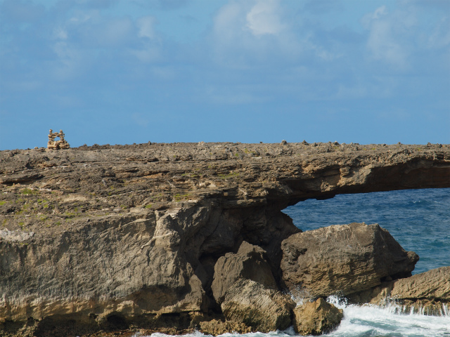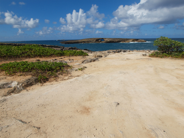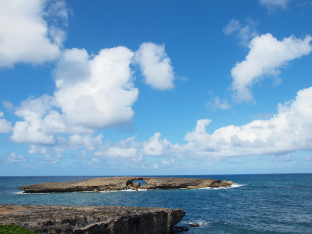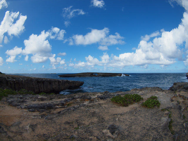 岬から向かって左側に、真ん中に穴が開いた岩(小島?)が見えました。