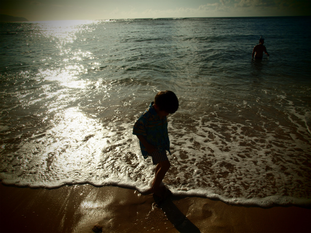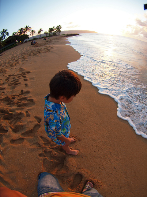 夕日が沈む前に少し時間があったので、快獣クンは波打ち際で遊びながら待ってました。