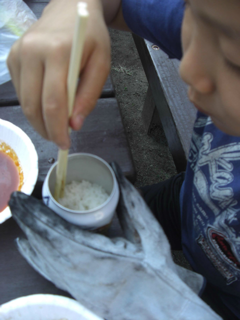 BBQ自体は火起こしに時間がかかりましたが、火がついたら棒つきのウインナーや焼きソバ、そして肉、海産物(エビ・ホタテ・イカ)と焼き、みんなで食べました。