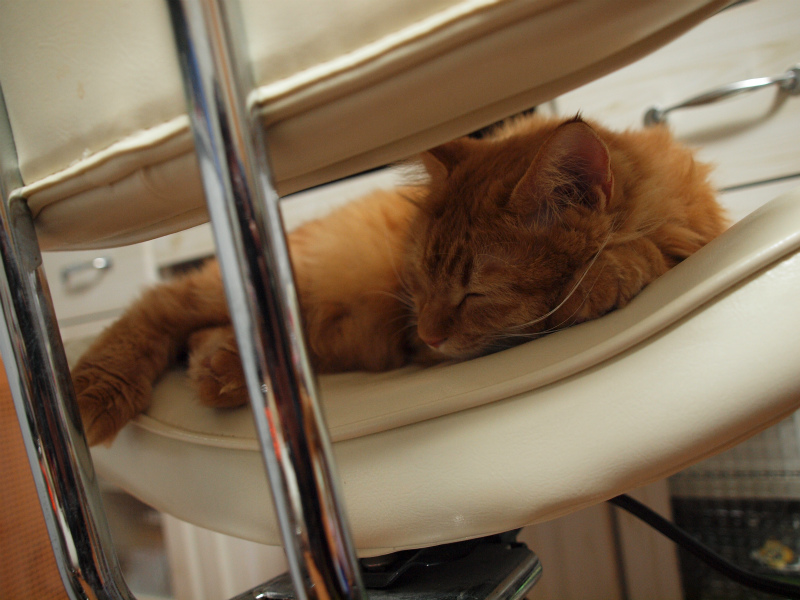 キャンプで使ったストーブで温まってますが、ストーブ近くのイスでにゃんこが。
