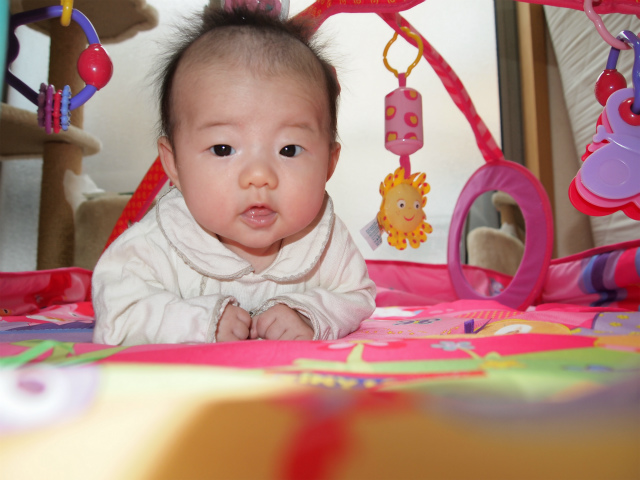 聖獣ちゃんは、すっかり首が据わったようで、うつ伏せでも力強く頭を持ち上げています。